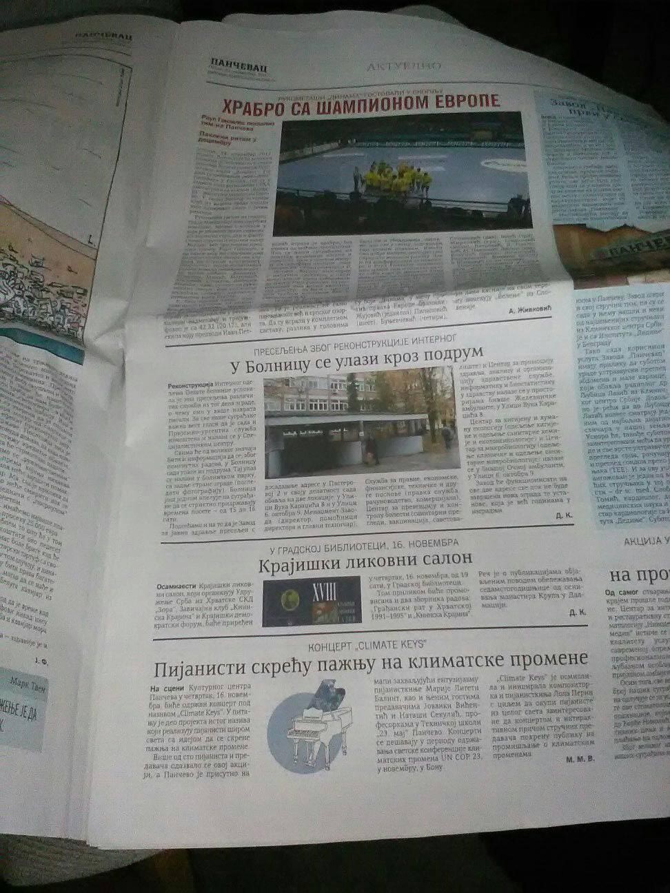 More than a hundred pianists worldwide take part in this action, Pancevo being one of the cities thanks to the enthusiasm by pianist Marija Ligeti Balint and her guest-speakers Jovanka Vicentic and Natasa Sekulic, teachers in 23. MayTechnical School in Pancevo. Concerts are being held during the International COP23 Climate Change Conference in November in Bonn.